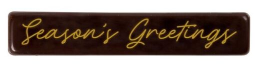 Add an elegant festive touch to your holiday desserts with this premium dark chocolate “Season’s Greetings” rectangle garnish. Made from rich, high-quality dark chocolate, each piece features a smooth finish and a beautifully scripted gold message that stands out on cakes, cupcakes, cookies, and pastries. Its sleek rectangular design provides a polished, professional look perfect for holiday displays and seasonal dessert menus. Easy to place and consistently crafted, this garnish enhances both the presentation and flavor of your creations. Ideal for bakeries, cafés, caterers, and home bakers looking to elevate Christmas and winter-themed treats.