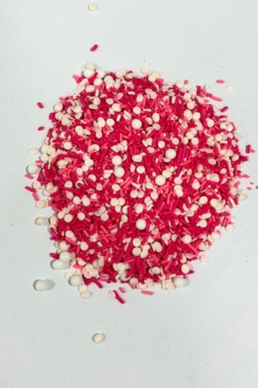 Add a romantic pop of color to your baked creations with this festive Valentine’s Sprinkle Mix. Featuring a charming blend of dark pink, light pink, and white jimmies, it’s perfectly accented with white 7 mm sugar beads and delicate white sequins for added texture and sparkle. This fully edible sprinkle mix is ideal for decorating cakes, cupcakes, cookies, and Valentine’s Day treats. Beautifully balanced in color and shine, it’s an easy way to create eye-catching desserts for celebrations, parties, and gifting.